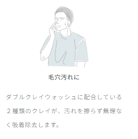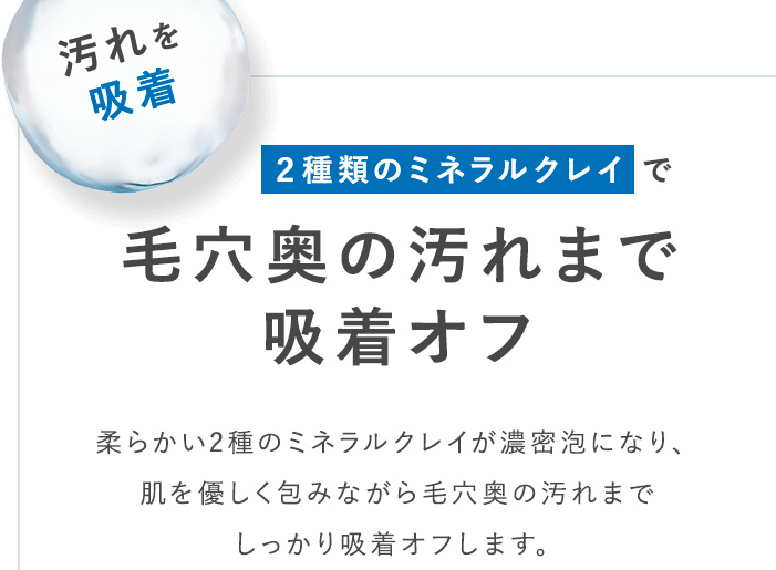 ダブルクレイウォッシュに配合している2種類のクレイ*が、汚れを擦らず無理なく吸着除去します。