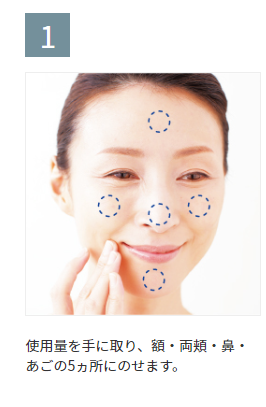 使用量を手に取り額、両頬、鼻、あごの5か所に載せます。