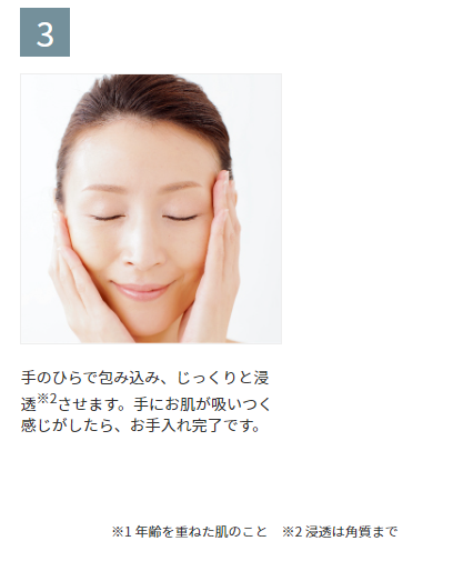 パッケージの「シワ改善」の表記に惹かれて購入。首までなじませるルールにしたら、保湿の抜け漏れが減った気がします(表示を見て選んだ個人の感想)。引用公式