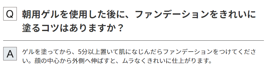 | 朝用ゲルを使用した後に、ファンデーションをきれいに塗るコツはありますか? | ゲルを塗ってから、5分以上置いて肌になじんだらファンデーションをつけてください。顔の中心から外側へ伸ばすと、ムラなくきれいに仕上がります。 |