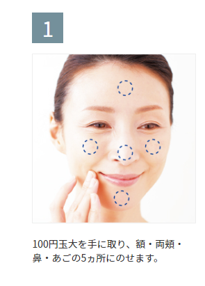 100円玉大を手に取り額、両頬、鼻、顎の5カ所にのせます