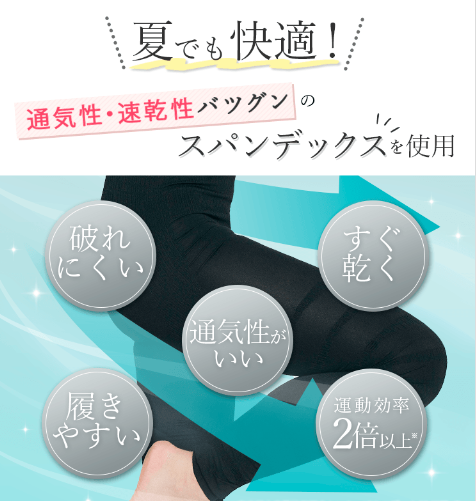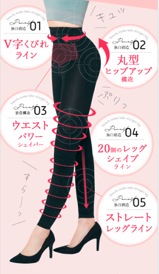 | メリット | ストレスで実現できる機能 履いた瞬間、バランス美脚を実感 *着用時の着圧効果による補正作用 スパンデックスを使用! |