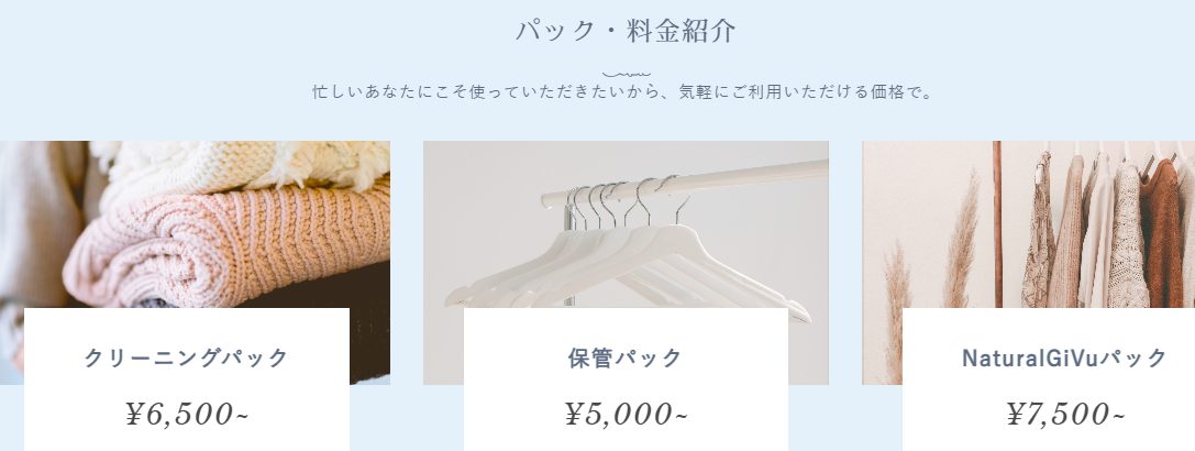 | 保管パックの値段 | 5点コース 4,545円(税込5,000円) 10点コース 15点コース 毛布コース シャツ専門15点コース 4,545円(税込5,000円) |