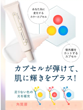 | 仕組み | カプセルがはじけて、足りない色を補充 肌にのばすとカプセルが弾けます それぞれの肌色の状態に応じ、足りないカラーを光で補いながら 今までにないあなただけの最適な肌を演出します |