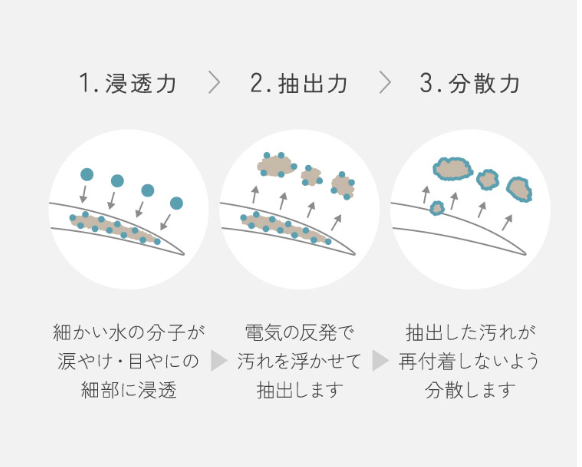 | 浸透力 | 細かい水の分子が涙やけ、目やにの細部に浸透 |