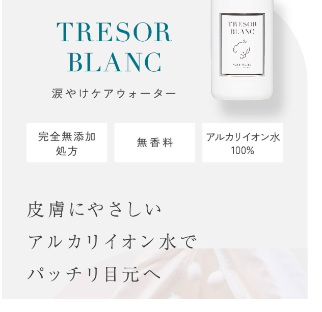 調べてみると、アルカリイオン水は体の酸性度を和らげてくれる働きがあるそうで、これが涙やけの原因の一つにアプローチしてくれているのかもしれません。TRESOR BLANC(トレゾールブラン)に、変えるるだけで手軽なのがありがたい!忙しい私でも続けられるのが何より嬉しいポイントです😍