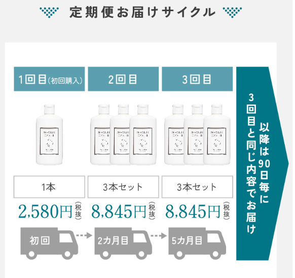 | 2回目以降の値段 | 2回目は30日後に20%OFFで3本9,730円(税込) その後は90日ごとに3本9,730円(税込) |
