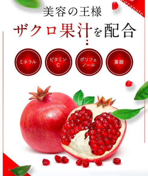 還元麦芽糖水飴(国内製造)、ザクロ果汁、大麦乳酸発酵ギャバ粉末、植物性乳酸菌(殺菌)粉末、セラミド含有米抽出物、コラーゲンペプチド(ゼラチンを含む)/ゲル化剤(増粘多糖類)、クエン酸、シクロデキストリン、クエン酸Na、香料、甘味料(スクラロース、アセスルファムK)