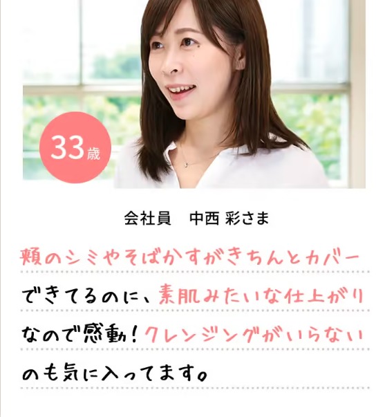 顔のシミ、そばかすがきちんとカバーできてるのに、素肌みたいな仕上がりに感動!クレンジングもいらないのも気に入ってます。