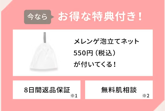 | 特典 | 泡立てネットプレゼント 8日間の返金保証付き |