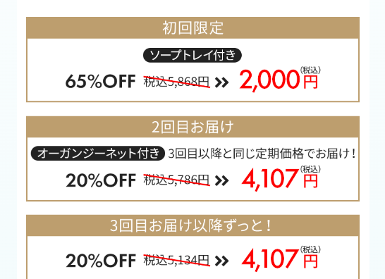 | 定期初回割引 | 65%OFFの2.000円(税込) |