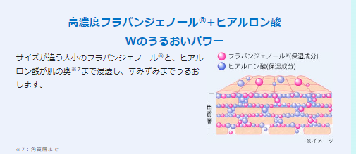 サイズが違う大小のフラバンジェノールと、ヒアルロン酸が肌の奥7まで浸透し、すみずみまでうるおします。