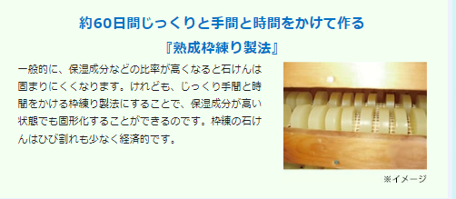 一般的に、保湿成分などの比率が高くなると石けんは固まりにくくなります。けれども、じっくり手間と時間をかける枠練り製法にすることで、保湿成分が高い状態でも固形化することができるのです。枠練の石けんはひび割れも少なく経済的です
