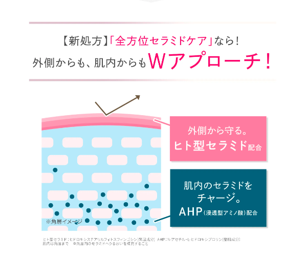 • 全方位セラミドケア:AHPとヒト型セラミドが角層深くまで浸透しバリア機能を支える