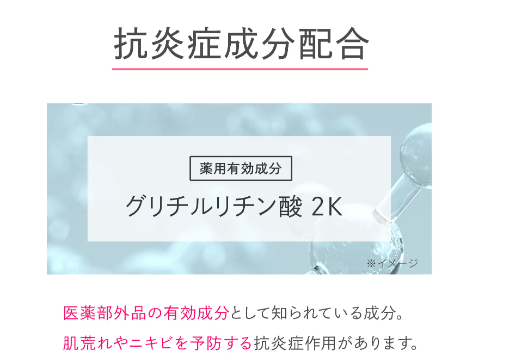 • 抗炎症有効成分グリチルリチン酸2K配合で、肌荒れやニキビ予防に配慮