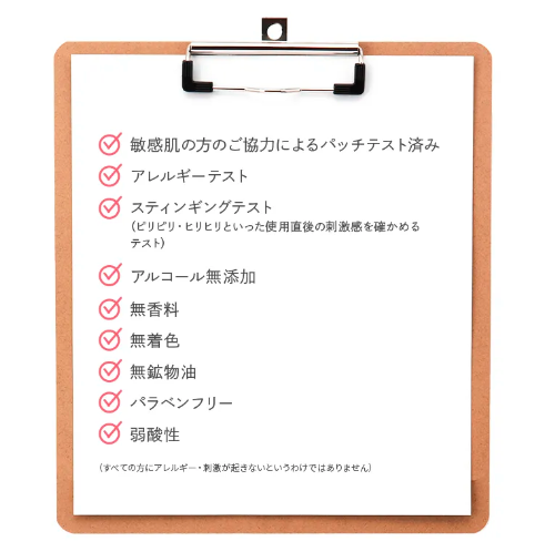 • 敏感肌研究25年に基づいた処方設計で、低刺激・弱酸性・6つのフリー処方(香料・着色料・鉱物油・パラベン・アルコール・界面活性剤フリー) :
