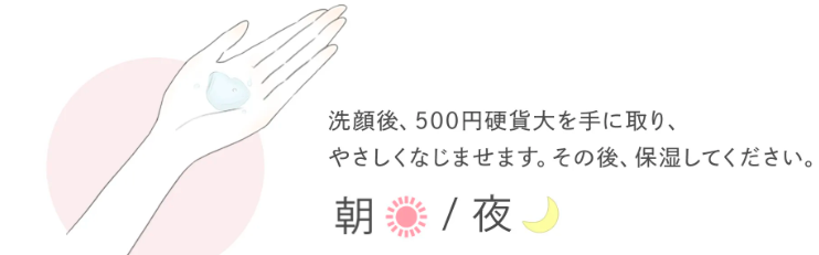• 洗顔後に500円硬貨大(約1回量)を手に取り、顔全体にやさしくなじませるだけ
