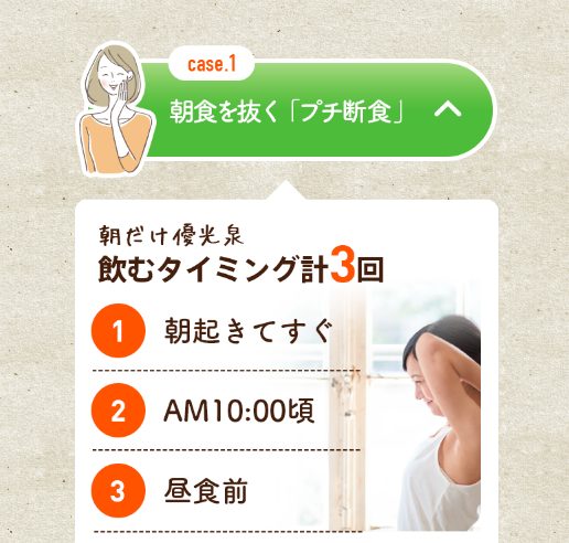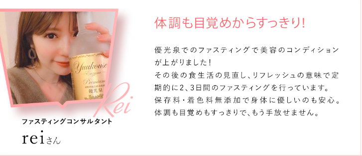 食事を酵素ドリンクに置き換える場合 朝昼夜どの食事を置き換えても大丈夫なのでしょうか? | どのお食事を置き換えて頂いても大丈夫です。自分の生活スタイルに合わせて取り組んで頂くのが一番です。なお、ダイエットを目的とされている場合は夕食を優光泉に置き換えて頂くことがおすすめです。 |