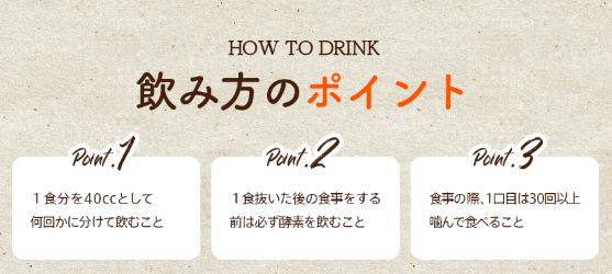 | 完全に断食するときは1日どれくらいの酵素を飲むべき? | 1食当たり酵素ドリンクの原液を40ccをお飲み頂くようご案内させて頂いておりますので、1日3食として最低でも原液を120cc飲んで頂けたらと思います。水や炭酸水でお好きな濃度に薄めてお召し上がりください |