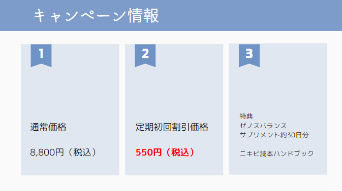 公式販売店なら定期初回割引価格の550円(税込)+ZENOSバランスサプリメントが毎回もらえたり、