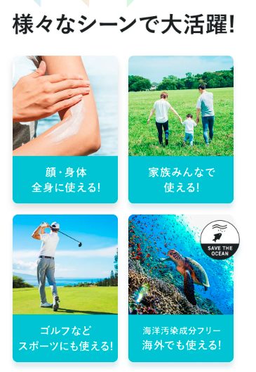 | メリット | 高い日焼け止め効果が期待 ベースメイクにも使える 着けている最中に潤い補給 敏感肌の人にも安心 |