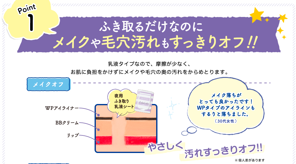 ズボラボ 夜用ふき取り乳液シートはふくだけでメイク落とし、洗顔、化粧水、乳液、美容液ができちゃう